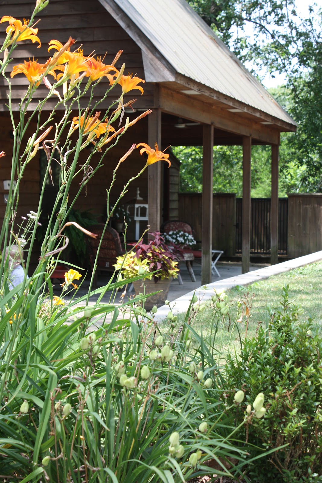 This has become my favorite outdoor spot! It is a porch to the barn. It's behind the house, beside the pool, and a great location to keep an eye on a toddler. There are two high powered fans that keep the air cool and the bugs sparse. The furniture is what Mike bought when he proposed in my backyard in Harvest. The little bench/coffee table, tall bird feeder, and side tables are from my grandparents. I'm loving the white impatiens there this year. I don't usually get to sit for long, but I try to stop and sit a bit every day.
